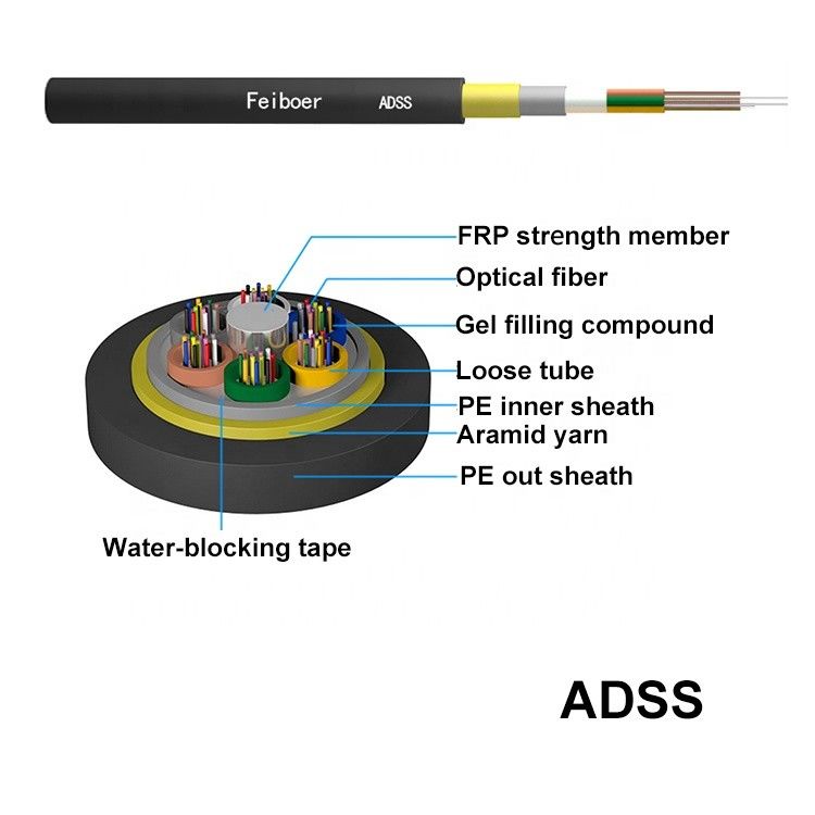 كابل ADSS عبارة عن هيكل مجدول من أنبوب فضفاض.الألياف الضوئية 250 ميكرون ، الأنبوب السائب مصنوع من بلاستيك عالي الجودة ، مملوء بمركب مقاوم للماء.يوجد في وسط قلب الكبل عضو قوة FRP ، يتم لف الأنبوب السائب (وحبل التعبئة) حول قلب التعزيز المركزي لتشكيل قلب كابل مدمج ومستدير ، ويتم ملء الفجوة في قلب الكابل بالماء منع حشو.الجزء الخارجي من الكابل عبارة عن غلاف داخلي من البولي إيثيلين (PE) ، ثم الأراميد ذو قوة الشد العالية الملتوية ، والأبعد هو الغلاف الخارجي للتتبع الكهربائي (AT).