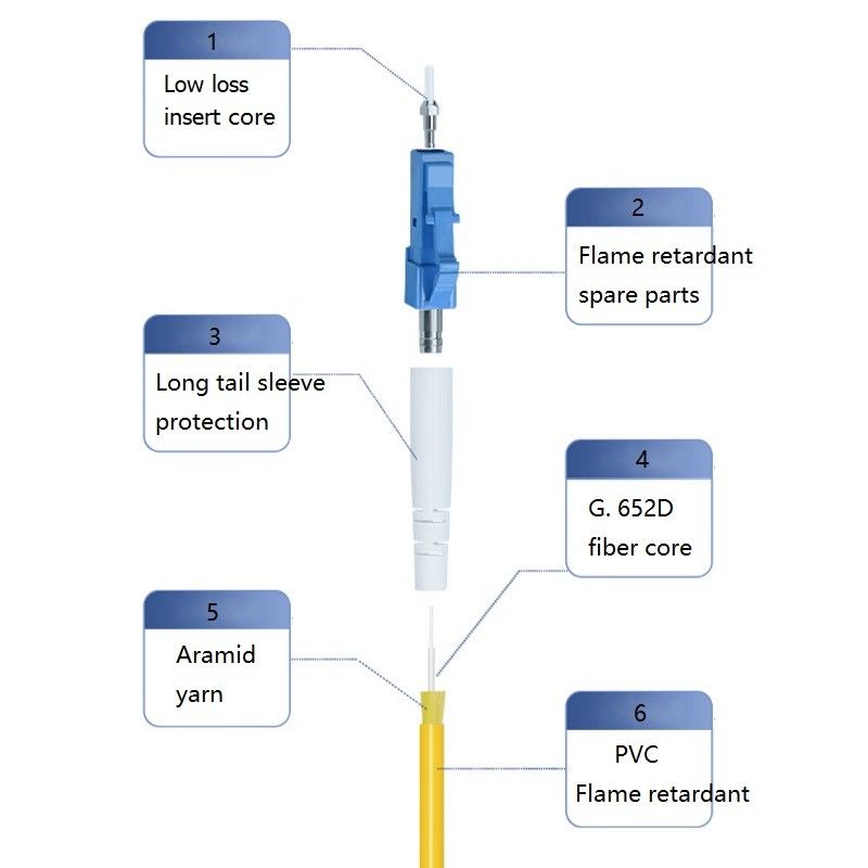 - درجة حرارة عمل الكابل تتراوح من -20 درجة مئوية إلى +70 درجة مئوية ، ويمكن أن تصل المتانة إلى أكثر من 1000 مرة. يمكن أن يكون طلاء المكونات PC أو UPC أو APC.